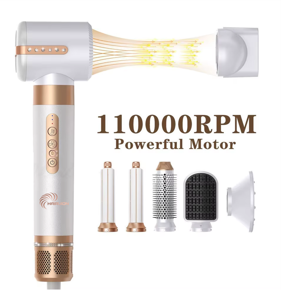 Hairvion 7-in-1 High-Speed Hair Dryer Brush is the ultimate all-in-one styling solution. Powered by a brushless high-speed motor and ionic technology, it dries, smooths, and styles with salon-level precision. Featuring 7 interchangeable attachments including diffuser, curler, and hot air comb.